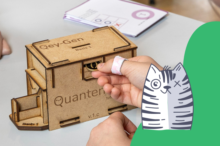 Eine neue Art, um Verschlüsselung sicherer zu machen, wird gerade erforscht. Dafür wird Quantenmechanik genutzt. Mit dieser Holzbox können wir die Quantenmechanik simulieren. Aber anstelle von Photonen und Polarisationsfilter benutzen wir eine Münze und den Qey-Gen.